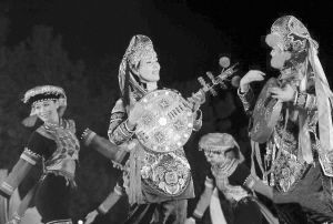 大型原生態(tài)歌舞“查姆”展演上,彝族演員在表演歌舞彈唱 秦萍供圖