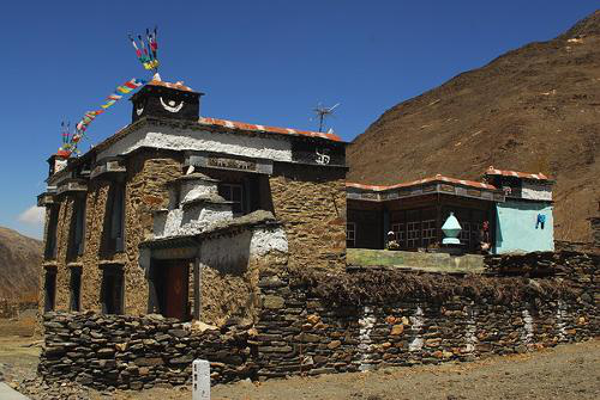 碉房是藏族很具代表性的民居之一,多為石木結(jié)構(gòu),外形端莊穩(wěn)固,風(fēng)格古樸粗獷。碉房一般有三到四層。底層養(yǎng)牲口和堆放飼料、雜物;二層布置臥室、廚房等;三層設(shè)有經(jīng)堂。由于藏族信仰藏傳佛教,誦經(jīng)拜佛的經(jīng)堂占有重要位置,神位上方不能住人或堆放雜物,所以都設(shè)在房屋的頂層。為了擴大室內(nèi)空間,二層常挑出墻外,輕巧的挑樓與厚重的石砌墻體形成鮮明的對比,建筑外形因此富于變化。
