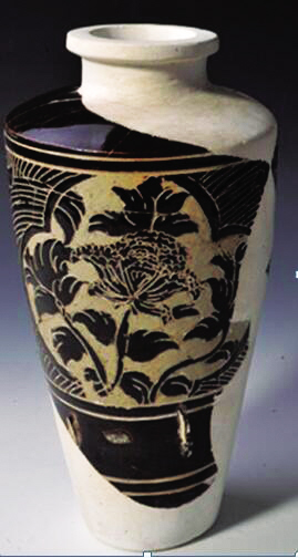 西夏經(jīng)瓶是靈武窯最具特色的西夏器類之一,其器型瘦長(zhǎng),肩部最寬,下腹?jié)u收,平底,假圈足;胎質(zhì)細(xì)膩致密,外壁施釉均不到底,內(nèi)壁施滿釉,釉色以褐釉為主,也有黑釉,白釉少見(jiàn),白釉瓷均施化妝土;紋飾以牡丹花為主,也有菊花,少見(jiàn)海棠花,輔紋以海水波浪紋和斜線紋為主,花紋細(xì)膩,構(gòu)圖流暢,疏密得當(dāng);整體構(gòu)圖大量使用開(kāi)光,搭配合理,講究對(duì)稱。