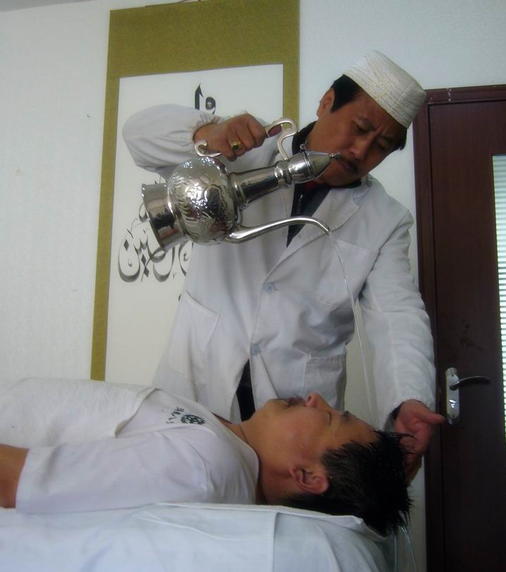 湯瓶八診療法,包括頭診、耳診、面診、手診、腳診、骨診、脈診、氣診八種療法,與現(xiàn)代經(jīng)絡學有相同的哲學思想。因人而異,運用不同的經(jīng)脈、竅穴診療。它主要是依據(jù)回族醫(yī)學基本理論,運用湯瓶水浴、末稍經(jīng)絡根傳法、放血、刮痧、火罐等湯瓶的基本手法,并結(jié)合穆斯林視為神圣的“杜阿伊”,分別作用于受施者身體的不同部位,操作者通過受施者的各種反應,即可判斷疾病之所在,進而調(diào)整施術的治療手法、輕重程度和次序頻率等,從而使受施者達到提高免疫機能、防病治病的目的。