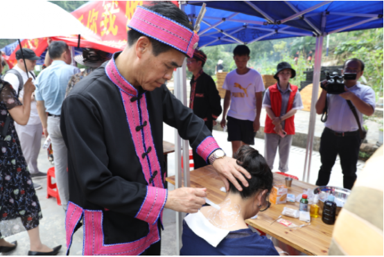 本次活動以2020年“文化和自然遺產(chǎn)日”的“非遺傳承,健康生活”為主題,重點圍繞傳統(tǒng)醫(yī)藥項目保護,普及“非遺”知識和健康生活理念,營造全社會共同參與、關(guān)注和保護傳承優(yōu)秀傳統(tǒng)文化濃厚氛圍而開展。邀請十位瑤醫(yī)藥傳承人帶領(lǐng)40多位瑤醫(yī)弟子各顯神通,在現(xiàn)場開展非遺項目義診活動,為游客免費問疹,展示泡藥療法、針灸療法、燈草療法、坐浴療法、拉伽通灸療法等10種技法?,幷锩恳粦羧思夷贸瞿檬纸^活在自家進行現(xiàn)場展示,黃泥鼓制作、樹葉豆腐制作、瑤族織繡技藝、釀酒技藝、舂糍粑、原創(chuàng)歌曲展示等,豐富多彩的各種技藝,讓游客流連忘返。