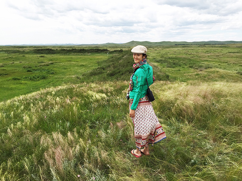 遠(yuǎn)遠(yuǎn)的,一輛嶄新的白色轎車在草原上揚(yáng)起一陣塵土,然后很快停在我們眼前。一對雍容華貴、穿著蒙古袍的俊男美女從車?yán)镒叱?,在午間強(qiáng)烈的陽光下閃閃發(fā)亮,氣場之強(qiáng)大的令人過目難忘。直到他們熱情地伸出雙手,我們才如大夢初醒般上前拜見。前來的女子正是舒泥,而男子便是我們要拜訪的牧民家的男主人鋼寶勒道。