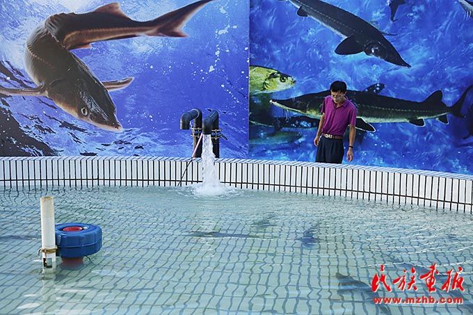 同江市赫哲族魚展館里養(yǎng)殖的鰉魚,這些鰉魚養(yǎng)大后會放歸自然。