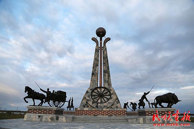 黑河市愛輝區(qū)坤河達(dá)斡爾族滿族鄉(xiāng)富拉爾基達(dá)斡爾族南遷廣場上的雕塑反映了達(dá)斡爾族在黑龍江畔開墾土地,建設(shè)家園的情景。