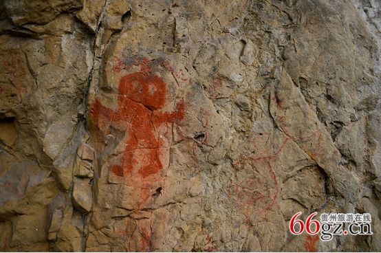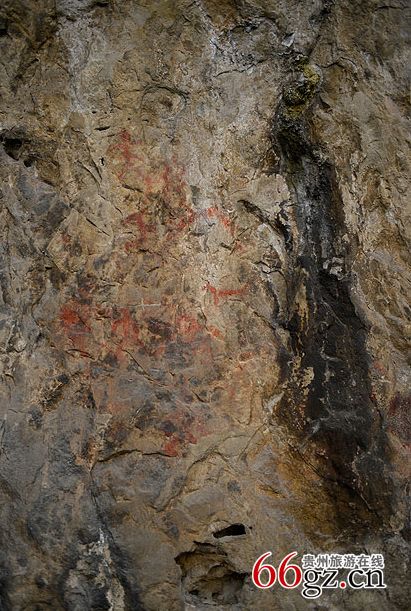 據(jù)資料載,金山洞古代崖畫以赭色涂繪人、馬、狗等等,隱約可見(jiàn)形態(tài)各異的大小圖像二三十個(gè)。人物多作行走狀,亦有雙手高舉者,似乎在祈禱。從其畫風(fēng)觀察,與相距不遠(yuǎn)的省級(jí)文物保護(hù)單位--長(zhǎng)順龍家院崖畫十分相似。