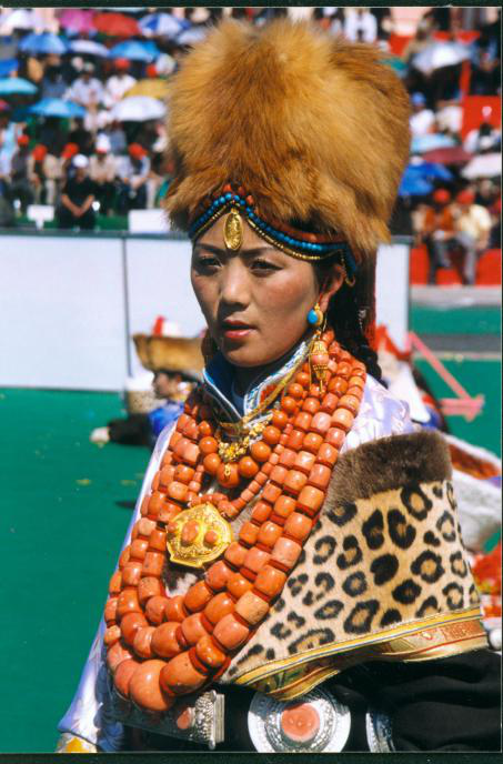藏族婦女發(fā)飾因地域之別而顯得豐富多彩。西藏部分地方的婦女喜戴巴珠,拉薩附近的婦女所戴三角形巴珠,平系與頭頂,兩枝向前,將分梳的兩條發(fā)辮分別盤在兩枝上。日喀則、江孜一帶的婦女戴弓形巴珠,弓背向上,梳成多條的發(fā)辮分別掛在弓的兩端。貴重的巴珠上面鑲有珊瑚、瑪瑙等,顯得富麗堂皇。姑娘一戴巴珠,就意為著長大成人,因此,第一次戴巴珠時,家中要為姑娘舉行傳統(tǒng)的成人儀式。