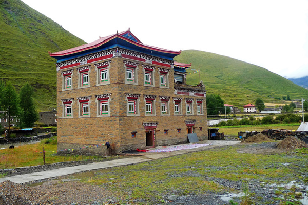 “碉院”則是一組較大的綜合性建筑,一般三層,局部四層,平面為四全院式,中間有較大的天井內(nèi)院,設(shè)小花壇,可種樹(shù)木花卉。內(nèi)院四周設(shè)回廊,石砌外墻用全封閉,除了門(mén)洞,墻上開(kāi)少量小窗。底層為牲畜圈、雜用房;二層多為倉(cāng)庫(kù)、接待房、傭工房等;三層為臥室、廚房和糧倉(cāng)、珍寶庫(kù);四層為經(jīng)堂、佛堂、經(jīng)書(shū)庫(kù)。有的在外墻女兒墻部分刷以黑色或棕色圓珠圖案,窗上檐一層或二層方椽挑出,作為傳統(tǒng)式藏窗形式,豐富了立面,改變了石墻面之笨拙感。