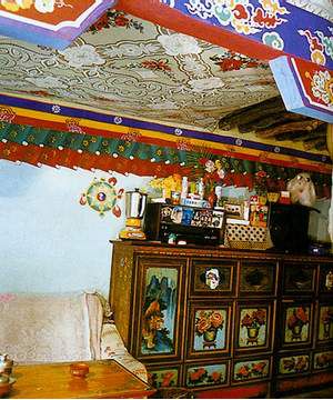 藏族民居室內(nèi)裝飾講究工整、華麗、亮堂,上至天花板下至與地板相接的墻角都采用雕刻、彩繪等藝術(shù)手段加以裝點,尤其是橫梁、柱頭和大門等木結(jié)構(gòu)空間是充分展示裝飾才能的地方,在這里裝飾效果盡其所能。此外寺廟重點佛堂,回廊墻壁上繪制彩畫,這也是一種重要的裝飾手段,而百姓居室內(nèi)的墻壁上用繪制花卉、彩條來取得裝飾效果。