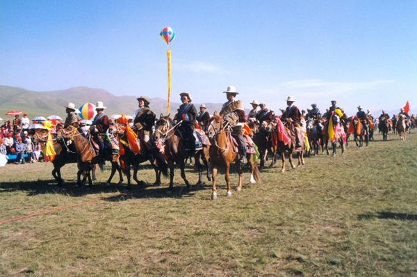 賽馬時藏區(qū)最普及的運動,各地都有賽馬會,一般在牛羊肥壯的七八月份舉行。賽馬有多種,有跑馬、走馬、馬上射擊、馬上拾哈達(dá)等。跑馬是比賽速度的,賽程有兩三公里的,也有十公里左右的。騎手大多是年輕人和十幾歲的少年,牧區(qū)賽馬多無馬鞍。比賽時,馬鬃馬尾挽上五色彩綢。跑馬比賽參加的馬匹多,競爭很激烈,以先到終點者為勝。賽走馬不但看速度,還要看馬的步伐和走勢,好的走馬不但速度快,步伐也非常平穩(wěn)。走馬的騎手多是善于策馬、精于騎術(shù)的成年人。走馬比賽在甘青藏區(qū)比較流行。