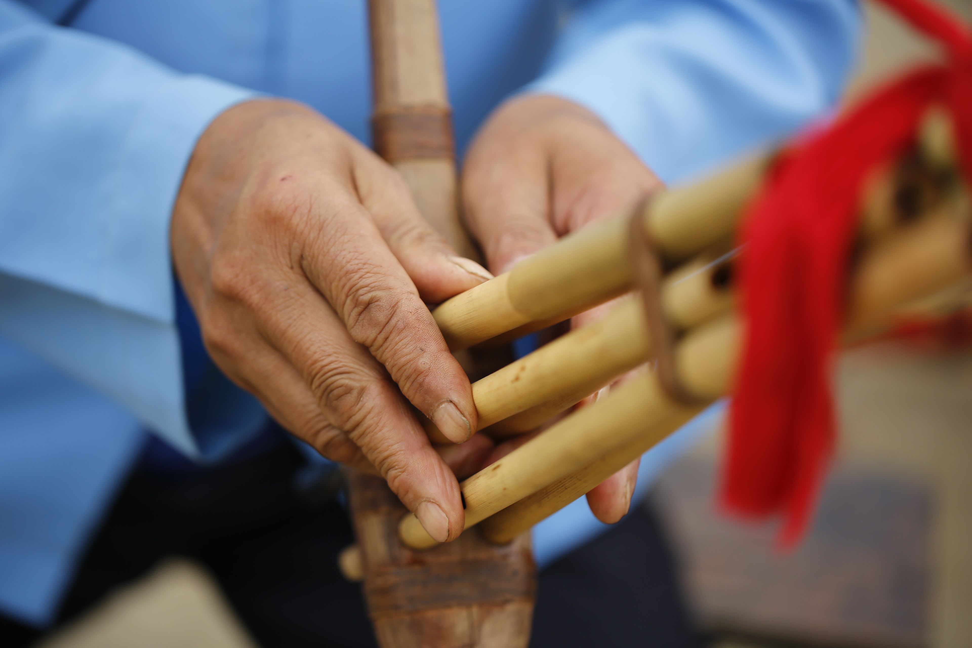 圖片名稱:貴州貴陽(yáng)苗族花鼓舞傳承人鄧開(kāi)倫教授他人吹奏蘆笙