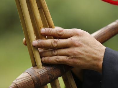 圖片說(shuō)明:貴州貴陽(yáng)苗族花鼓舞傳承人鄧開(kāi)倫教授他人吹奏蘆笙