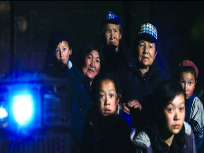 圖片名稱:認(rèn)真看電影的村民